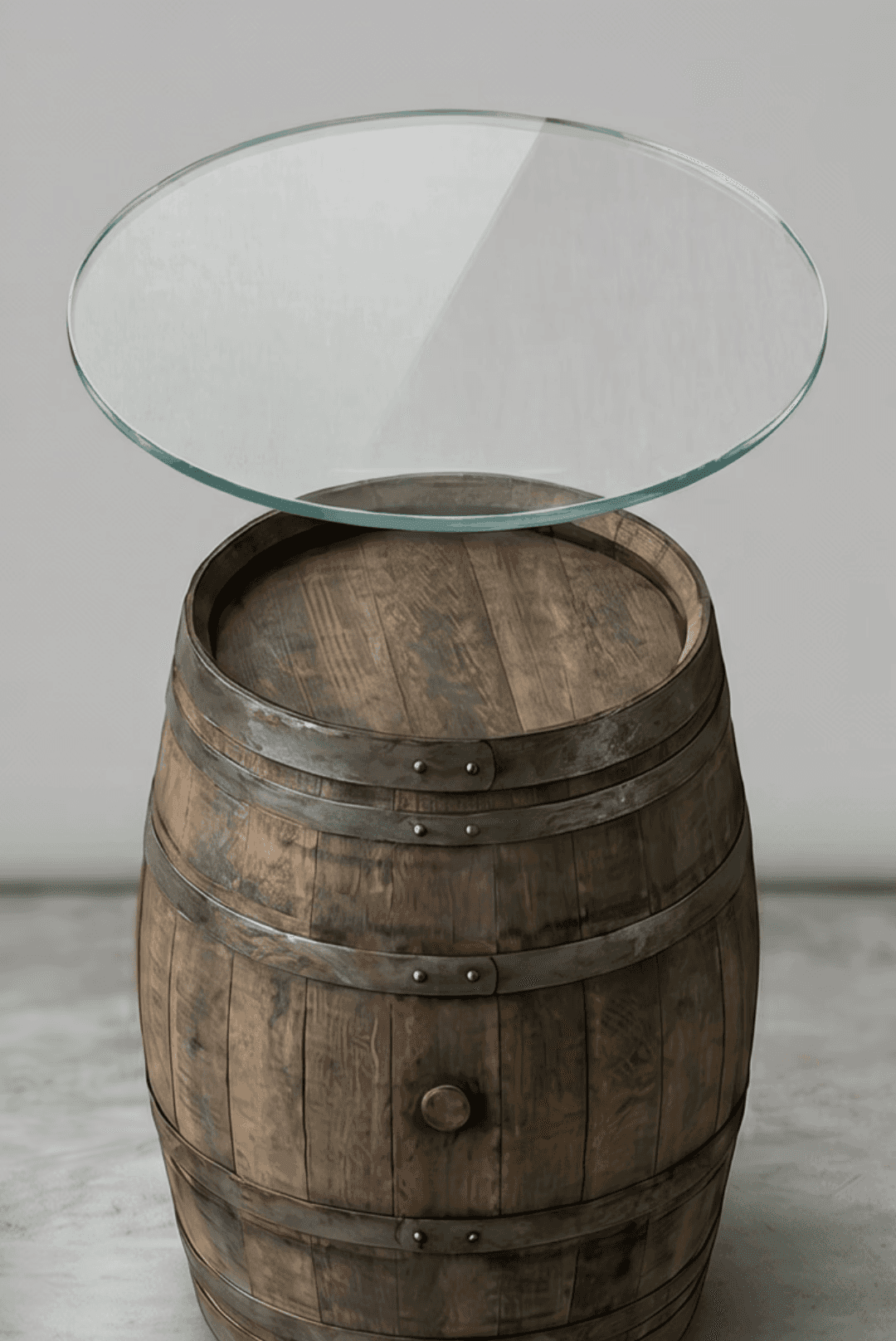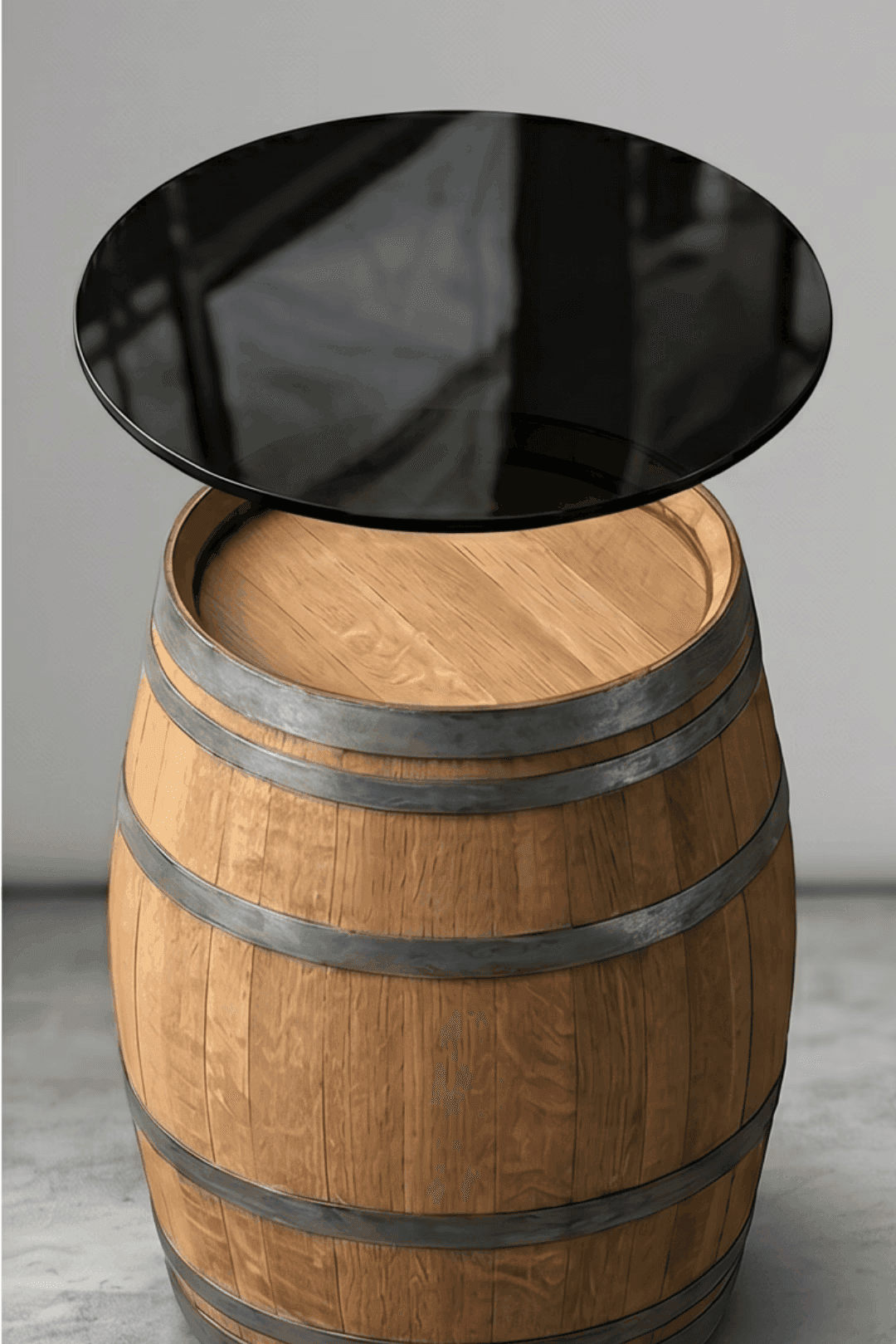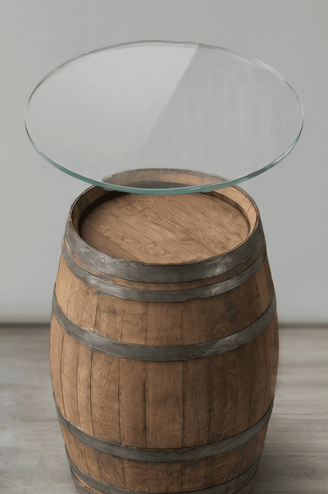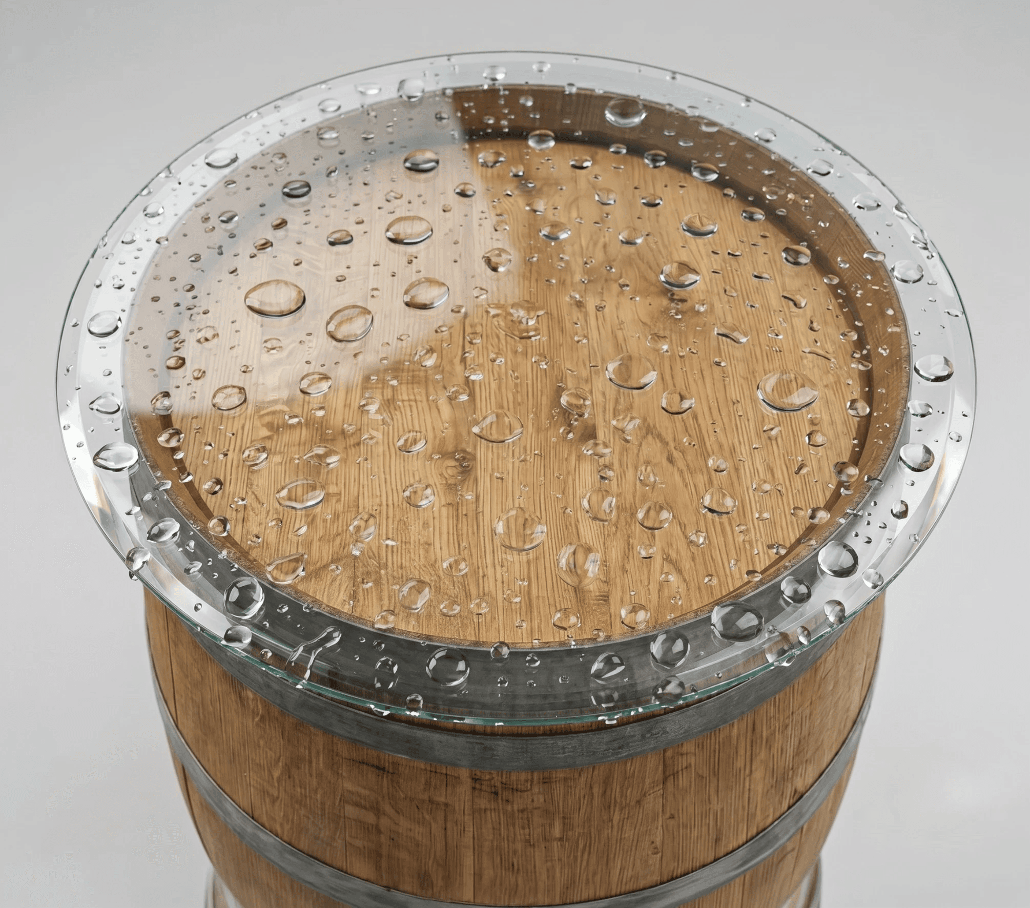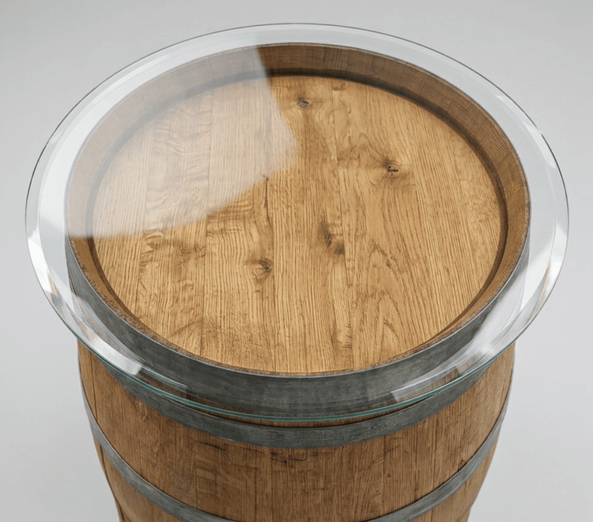 Ziehen Sie den Regler. Sie sehen dasselbe Fass, einmal nackt, einmal mit Glasplatte. Aus Deko wird Möbel. Zwei Minuten, ohne Werkzeug.