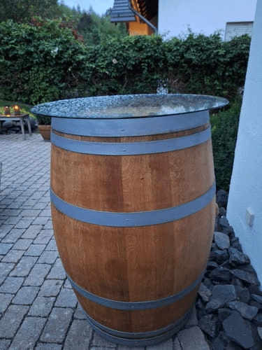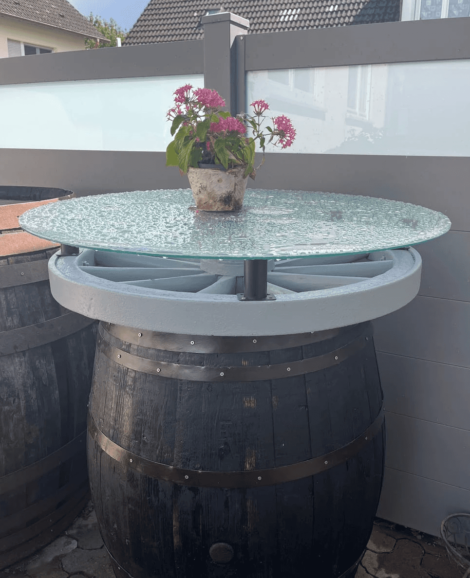 Egal ob Weinfass, Bierfass, Holzfass, Eichenfass oder Barrique. Eine runde Glasplatte macht daraus einen wetterfesten Stehtisch. In zwei Minuten, ohne Werkzeug. Ab 52 €.